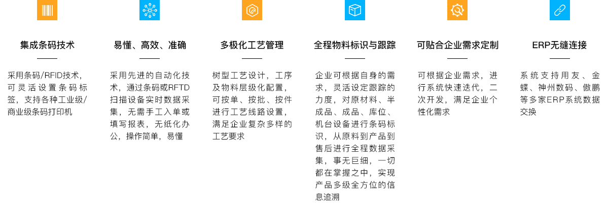 实时、高效、准确地跟踪产品,在每道工序及每个质检环节的全过程,使企业具备更完善、更有竞争力的生产过程和品质管理能力。